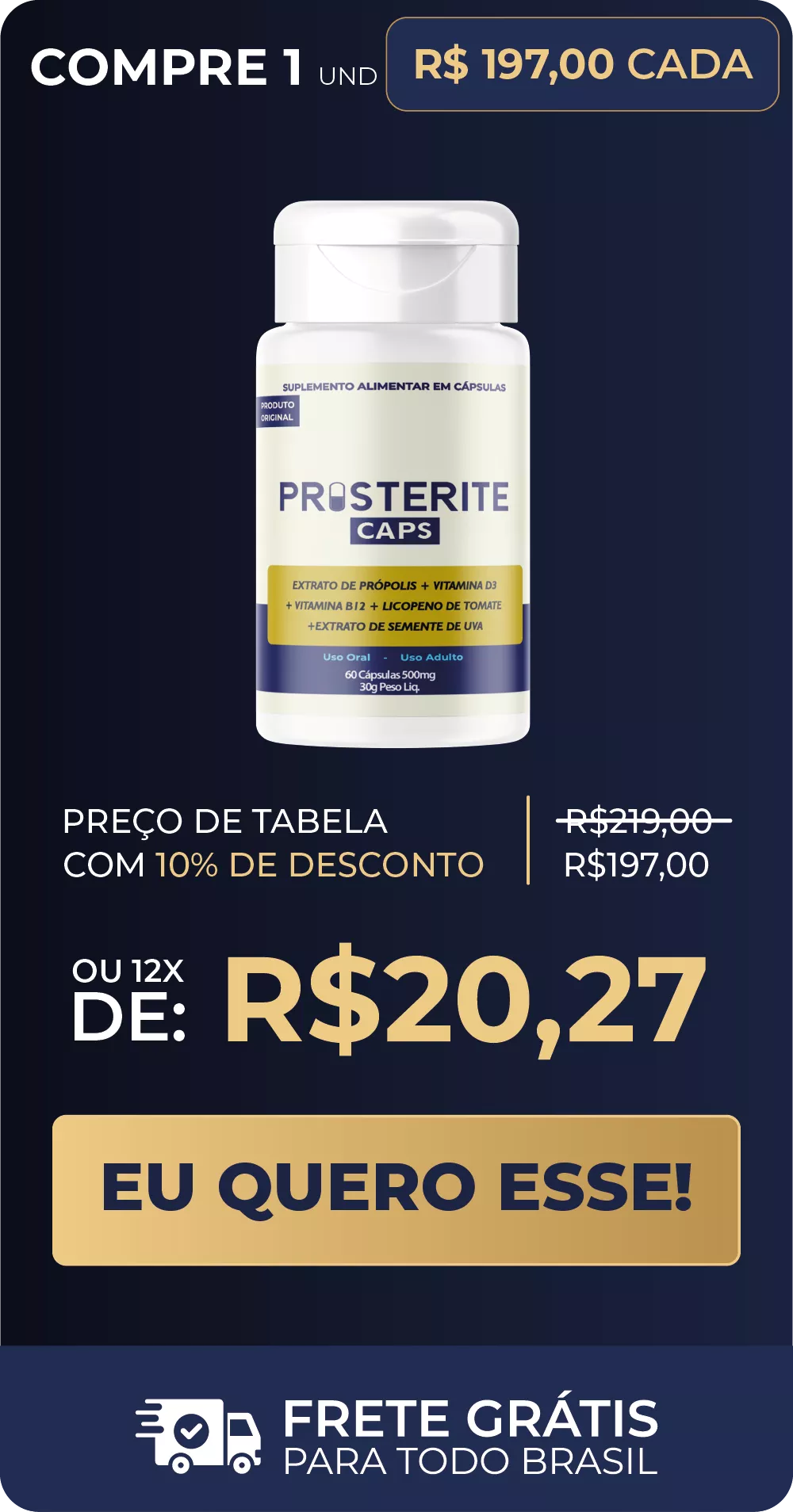 Prosterite Caps combina ativos poderosos para proteger, restaurar e fortalecer sua saúde prostática de forma natural e eficaz. Ação anti-inflamatória e antioxidante poderosa Alívio do desconforto urinário e melhora do fluxo Suporte total para a saúde da próstata Com Extrato de Semente de Uva, Licopeno de Tomate, Cúrcuma, Vitamina D3, Própolis, Astaxantina e Vitamina B1, você cuida da sua saúde sem abrir mão da sua qualidade de vida.